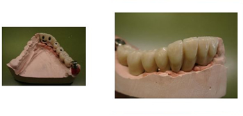 メタルフレーム(金属キャップ)の上に、セラミック(陶材)を強固に焼き付けて形成したものです。見た目、強度共に信頼のおける逸品でありますが、金属を裏うちしている関係上、色調再現性や透明感・明るさは、オールセラミックにやや劣ります。現状、自費(保険適用外)を代表されるロングセラーの人工の歯です。 |